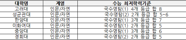 [표] 2027학년도 주요 대학 논술 전형 수능 최저학력기준
