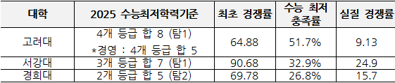 [표] 2025학년도 상위권 대학 논술 전형 최종 경쟁률 vs 실질 경쟁률