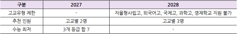 수시 지역균형 전형은 선발 인원 확대 외에도 굵직한 변화들이 많다. 우선 지원 자격에서 일부 고교 유형이 제한된다. 기존에는 고교 유형에 대한 제한이 없었지만 2028학년도부터는 자율형사립고, 외고, 국제고, 과학고, 영재학교’ 출신은 지원이 불가하다. 그리고 고교별 추천 인원은 2명에서 3명으로 확대된다. 수시 지역균형 전형이 내신 경쟁이 치열한 자사고와 특목고 학생들이 주로 관심을 가지는 전형은 아니었지만 2028학년도부터는 지원 자체가 불가해지고, 고교별 추천 인원이 확대되면서 일반고에서 성실하게 내신과 비교과를 쌓아온 학생들에게 지원 기회가 확대됐다는 점은 주목할 만하다.