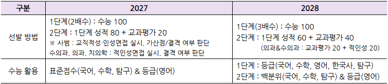 또한 수능 활용 점수가 기존에는 표준점수를 활용했으나 2028학년도부터는 1단계는 등급, 2단계에서는 백분위를 활용하는 것으로 변경된다. 일반 모집단위 기준으로 수능으로만 선발하는 1단계 선발 배수 확대, 2단계에서의 수능 반영 비중 축소와 더불어 수능 성적 산출 시 등급 및 백분위를 활용한다는 것은 수능의 영향력 축소로 이어질 수 있다. 수능 활용점수 중 상위권을 촘촘하게 변별할 수 있는 것이 표준점수이기 때문이다.