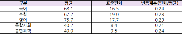 고1 학생들의 9월 모의평가 과목별 성적을 보면, 수학은 평균이 67.2점으로 가장 낮고 표준편차가 19.0으로 가장 크게 나타났다. 평균에 비해 학생들의 점수가 얼마나 흩어져 있는지 나타내는 변동계수 역시 0.28로 다른 과목에 비해 가장 크게 나타나 이미 고1 시작부터 수학 영역에서 학생들의 실력이 가장 크게 벌어진 것을 볼 수 있다. 반면 통합사회는 50점 만점 중 평균이 40.2점으로 매우 높고 표준편차가 8.4로 낮아 변동계수 역시 0.21로 다른 과목에 비해 가장 낮게 나타났다. 이를 통해 통합사회에서 학생간 실력 차이가 가장 작은 것을 알 수 있다.