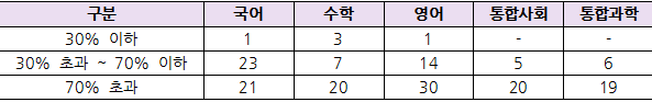 각 영역의 정답률에 따른 문항 수를 살펴보면, 정답률이 30% 이하 문항은 수학이 3문항으로 가장 많았으며 국어, 영어가 각 1문항이 출제, 통합사회와 통합과학은 1문항도 출제되지 않았다. 이처럼 정답률이 70%를 넘는 문항이 대부분 출제되었음에도 불구하고 통합과학에서는 성적이 낮아질수록 오히려 학생들의 편차가 크게 나타나고 있다는 것은 그만큼 아직 학생들의 통합과학에 대한 준비도가 낮다는 것을 보여준다. 이는 과학 영역 학습에 대한 부담을 가지는 학생이 많다는 것으로 분석된다.