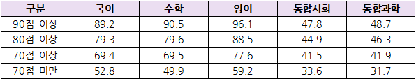 그리고 70점 이상인 중상위권과 70점 미만인 중위권 이하의 경우 수학에서 19.6점으로 가장 큰 차이를 보였다. 다만 통합과학이 50점 만점임을 감안할 때 10.2점의 차이가 난다는 것은 오히려 다른 과목에 비해 격차가 크게 벌어지는 것으로 볼 수 있다.
